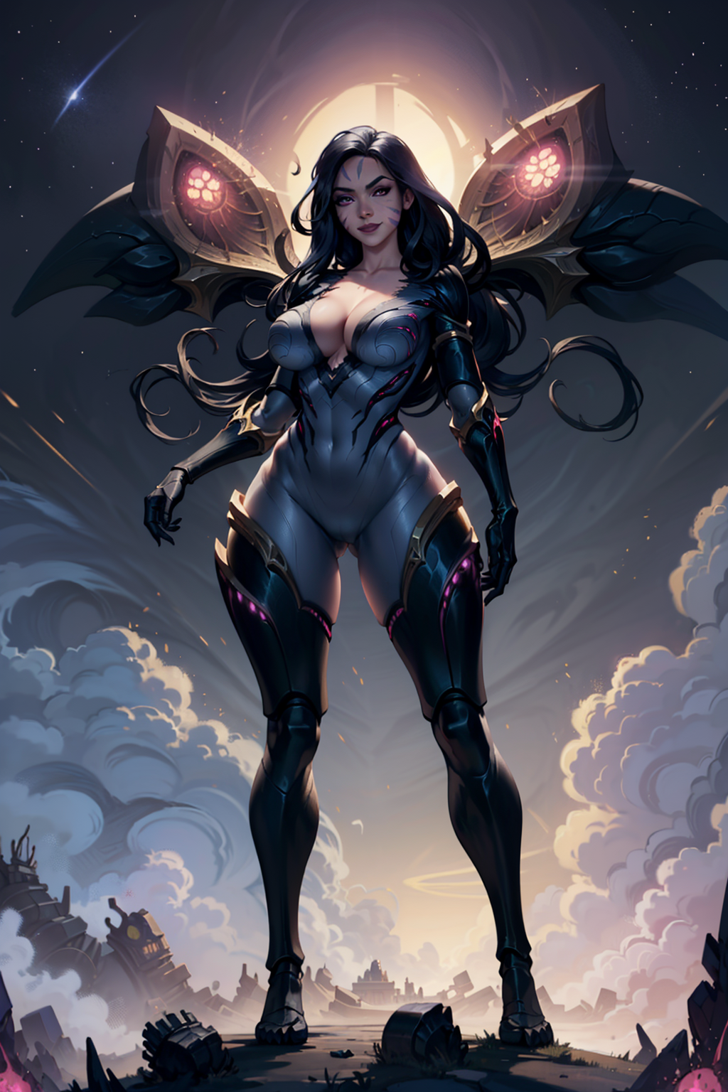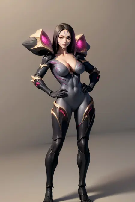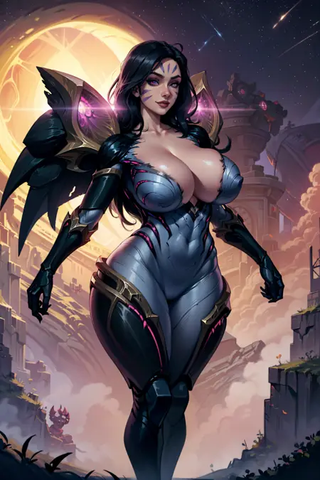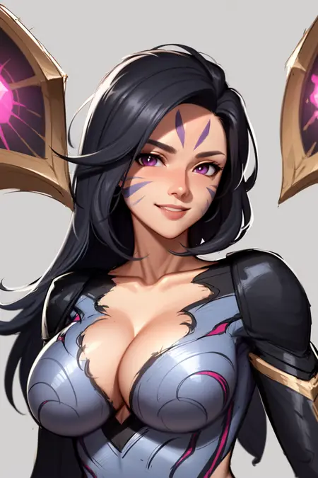 其他提示词:1girl, black hair, long hair, purple eyes, facial mark, bodysuit, wings