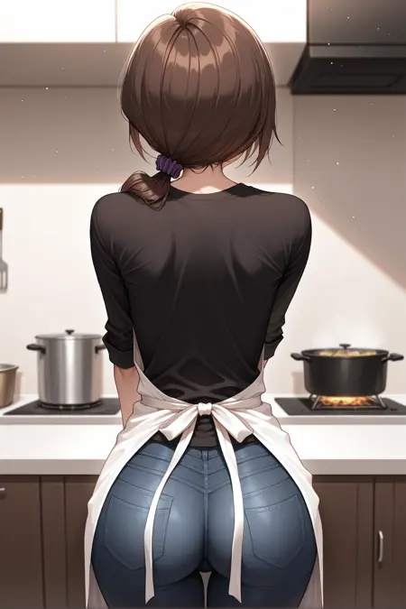追加の肯定的トリガー/キーワード: green eyes, brown hair, low ponytail, motherly