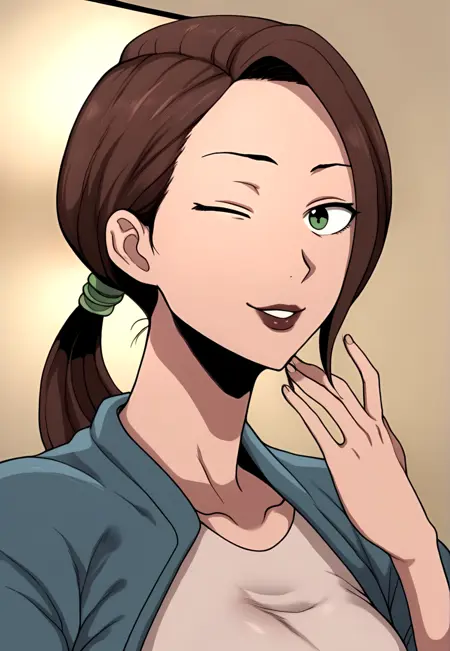 score_7_up,womanmri,green eyes,low ponytail,brown hair,motherly,large breasts