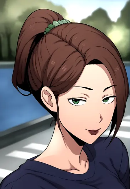 额外正面触发/关键词:绿色眼睛、棕色头发、低马尾、母性