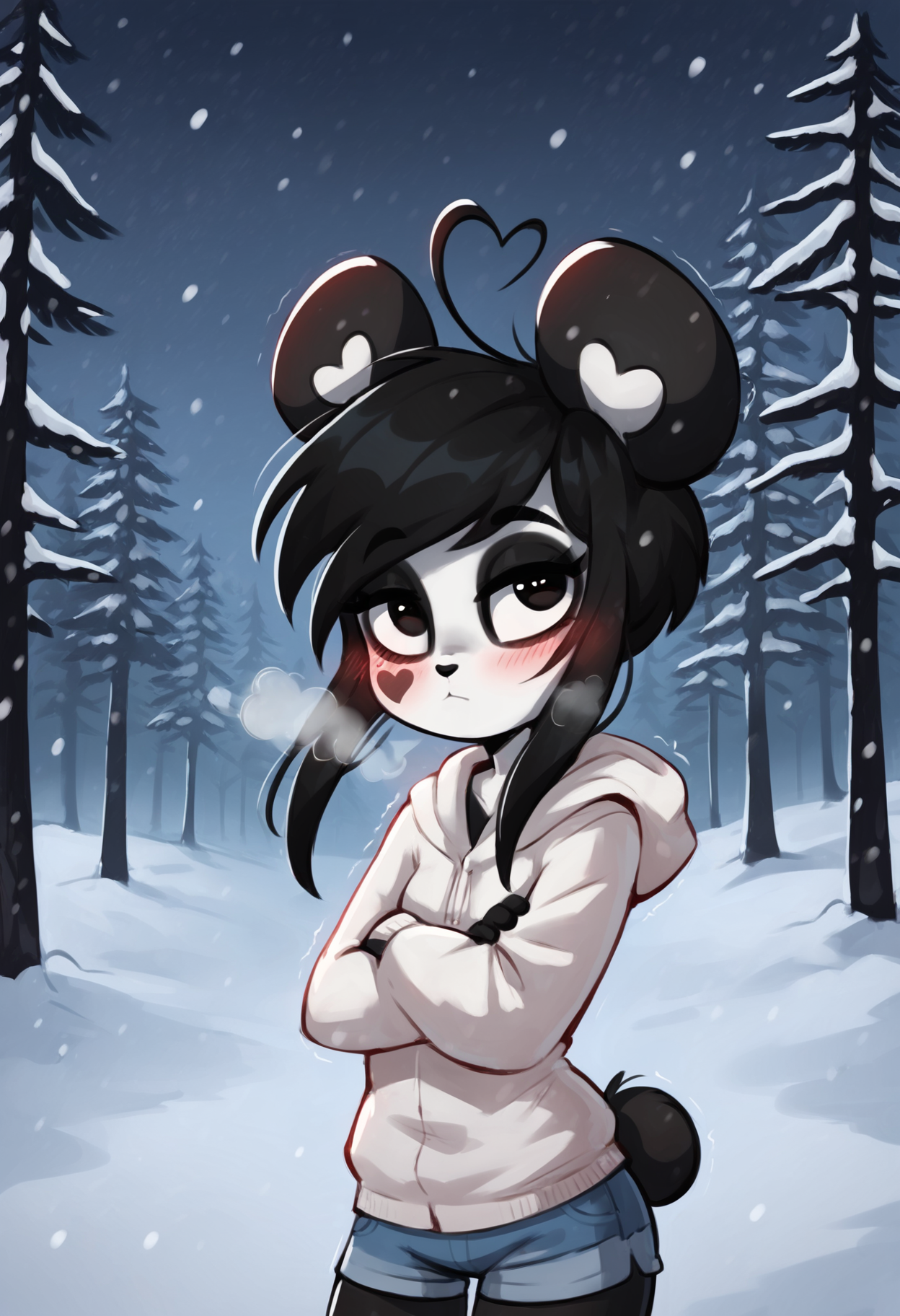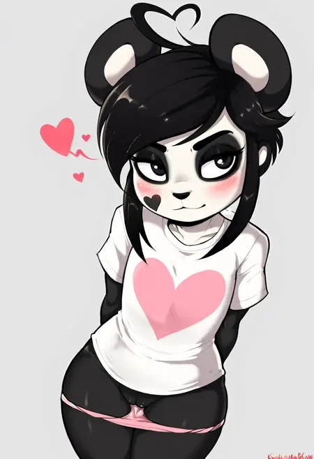 プロンプト:kenny \(kenashcorp\), 1girl, (panda, panda girl), furry, panda ears, animal nose, black fur, white fur, eyes makeup, black eyes, panda tail, heart ahoge, cheek heart, black arms, black legs, black hair, medium hair