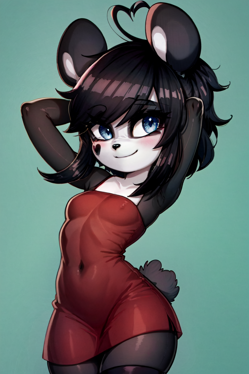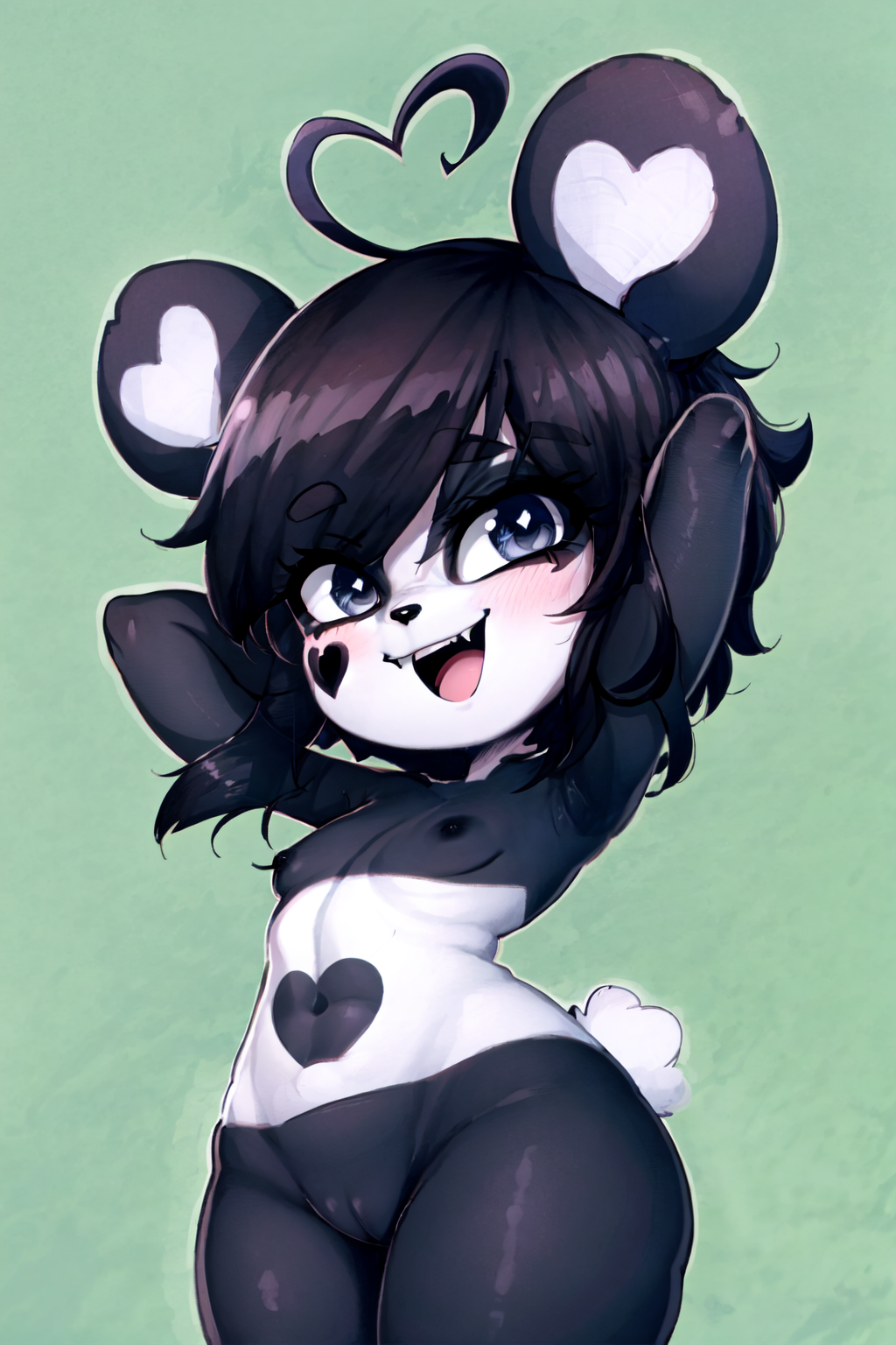 Prompts are : kenny \(kenashcorp\), 1girl, (panda, panda girl), furry, panda ears, animal nose, black fur, white fur, eyes makeup, black eyes, panda tail, heart ahoge, cheek heart, black arms, black legs, black hair, medium hair