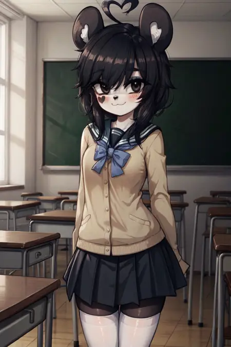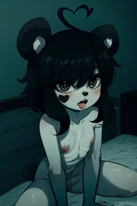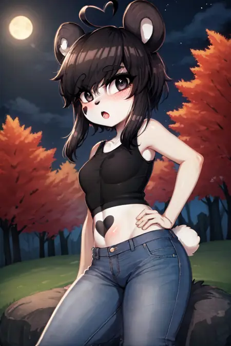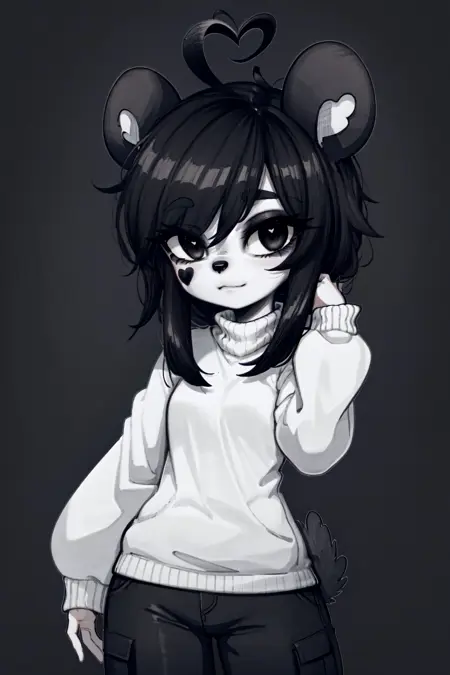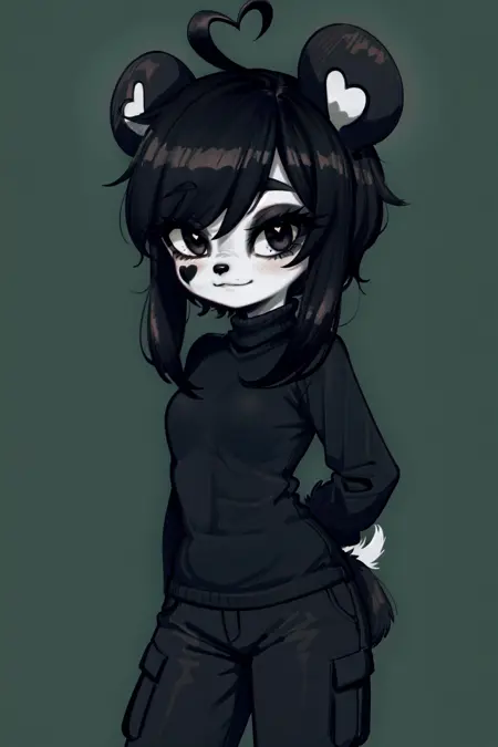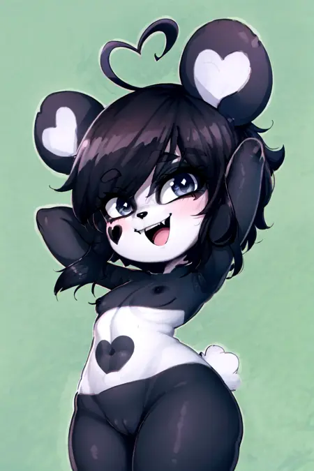 提示词:kenny \(kenashcorp\), 1girl, (panda, panda girl), furry, panda ears, animal nose, black fur, white fur, eyes makeup, black eyes, panda tail, heart ahoge, cheek heart, black arms, black legs, black hair, medium hair
