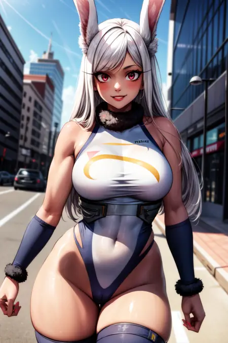 Mirko_NDV, 1girl, red eyes, white hair, large breasts, long hair, dark-skinned female, rabbit girl, animal ears, rabbit ears, muscular female