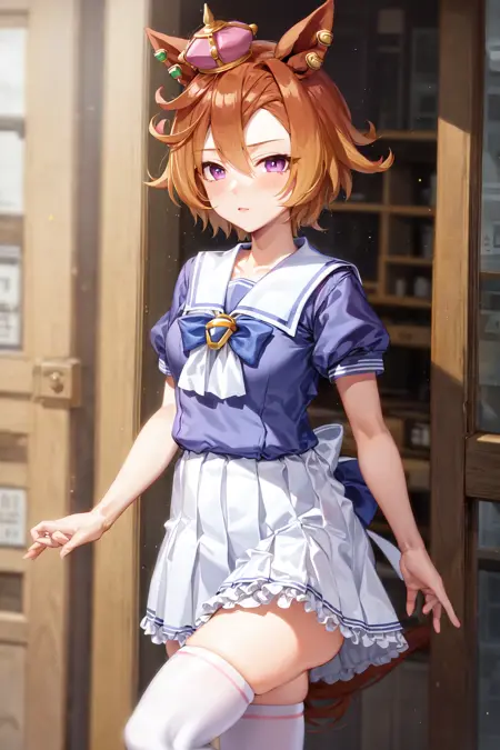 - Tracen学校制服、夏制服、セーラーファッション、ふわふわショートスリーブ、ネクタイ、馬蹄飾り、水兵服カラー、水兵シャツ、フリル、白スカート、紫シャツ、ミニスカート、絶対領域、白ハイソックス、茶色の靴、靴