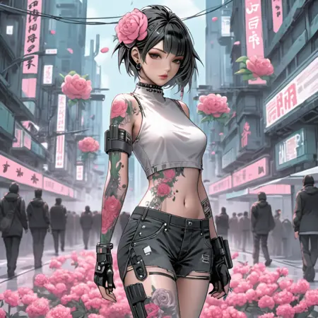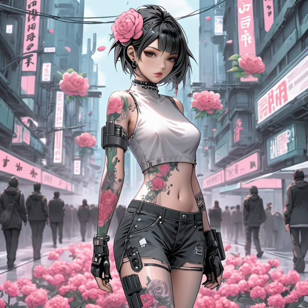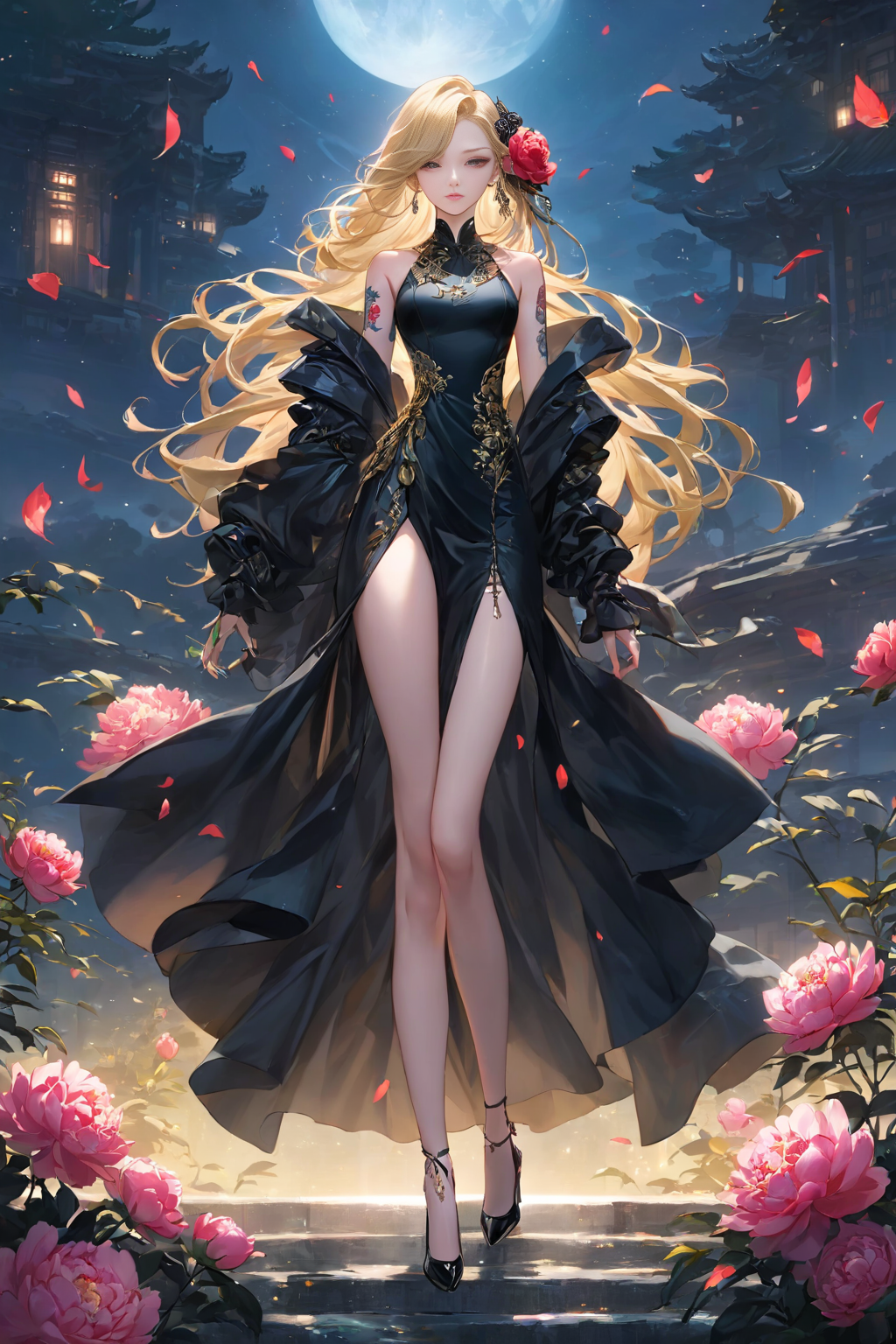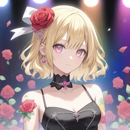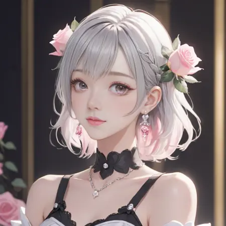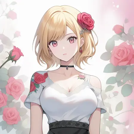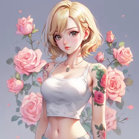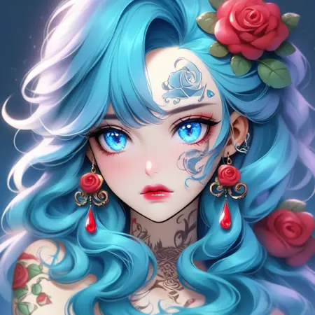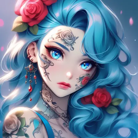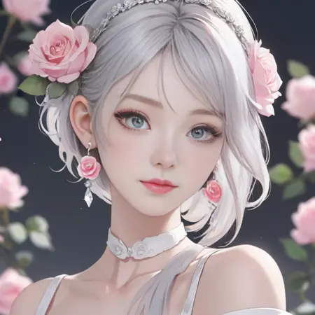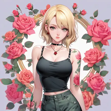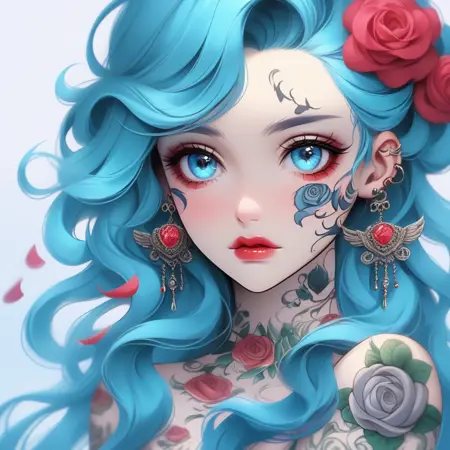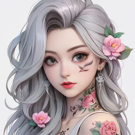 Prompts: Rose accessories , peony accessories, flower tattoo (on the neck or the face), glamorous curls. I hope you can like it and made some .