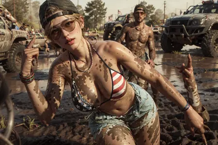 프롬프트: zaraZof1가 그린 생생하고 정교하며 전색으로 상세히 묘사된 초상화, 비키니와 파란색 반바지를 착용한 여자아이, 검은 모자, 선글라스, 큰 가슴, 흙으로 뒤덮인 몸, 극적인 캐릭터 구성, Alessio Albi, Nina Masic, 선명한 초점, 자연광, 피하 산란, f2, 35mm, Mud Girl