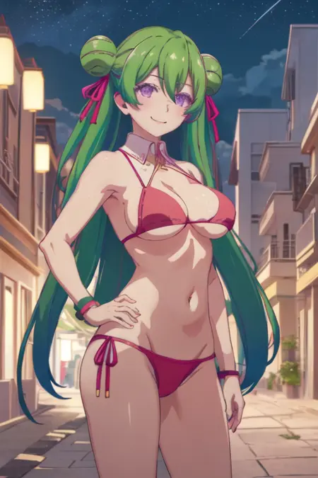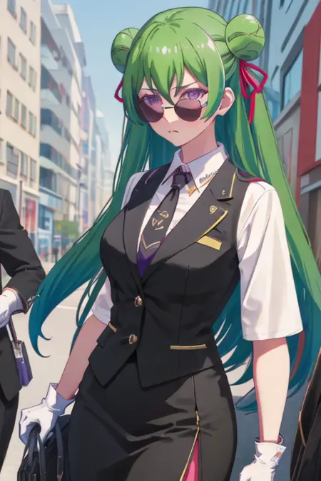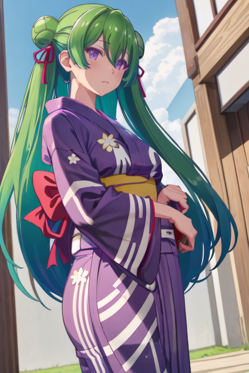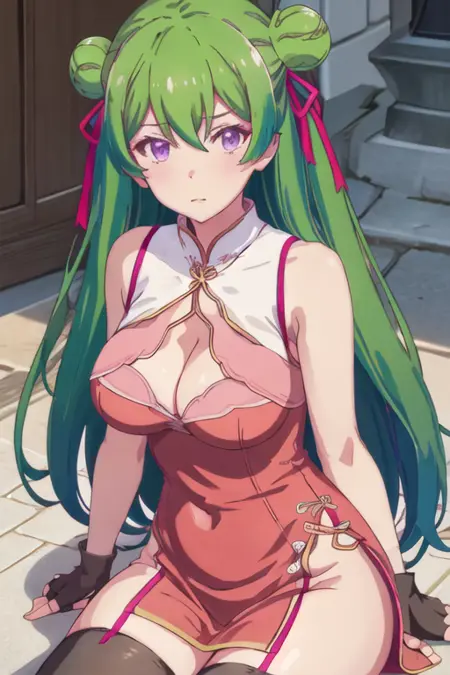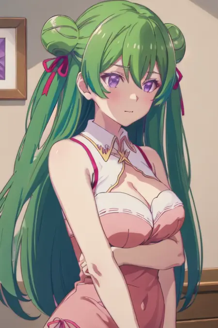 The trigger word is bai_mongfa_renaiflops, and the recommended tags are best quality, masterpiece, highres, solo, {bai_mongfa_renaiflops:1.15}, green_hair, long_hair, hair_bun, ribbon, hair_ribbon, purple_eyes, double_bun, bangs, hair_between_eyes, breasts.