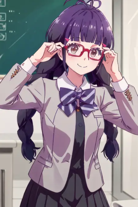 トリガー語はizumisawa_aoi_renaiflops、推奨タグはbest quality, masterpiece, highres, solo, {izumisawa_aoi_renaiflops:1.15}, long_hair, glasses, red-framed_eyewear, braid, hair_ornament, twin_braids, hairclip, black_hair, bangs, brown_eyes, antenna_hair, purple_hairです。