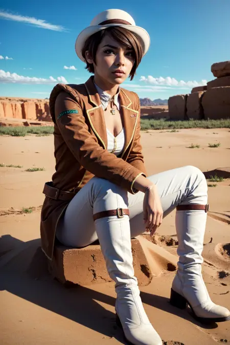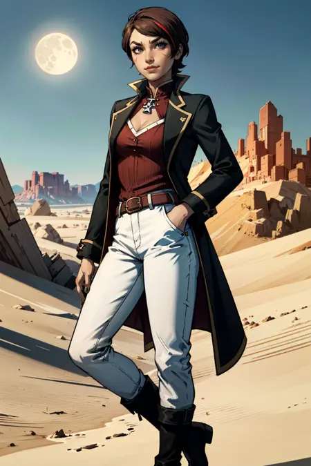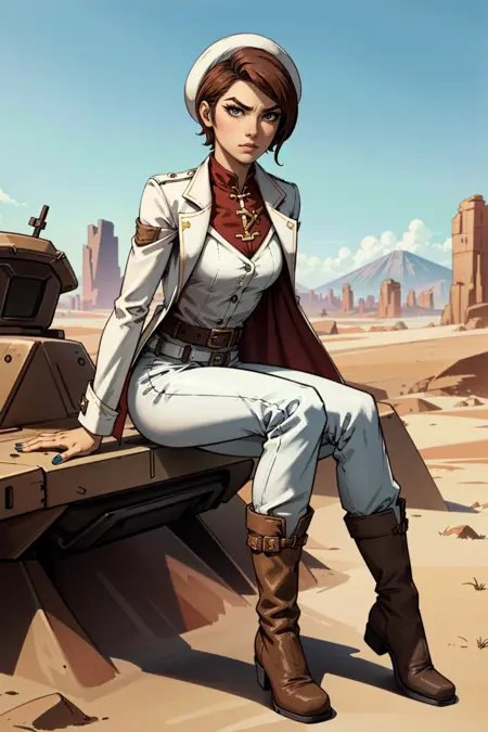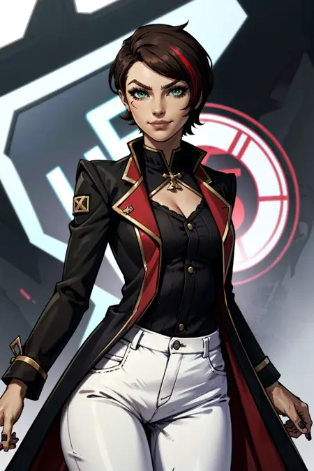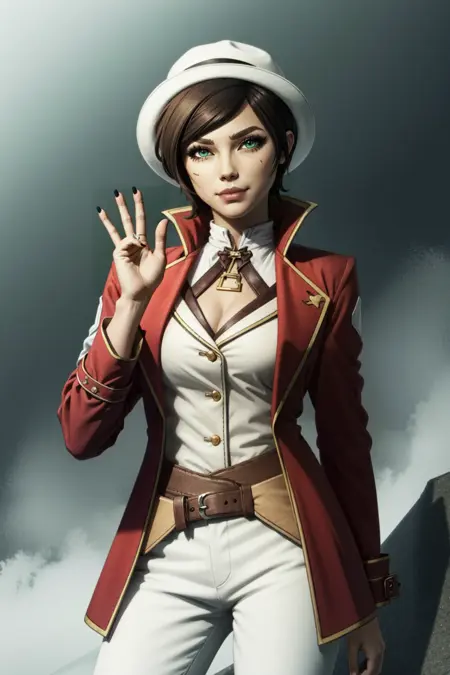 lora:FionaV1.4:0.8, 1girl, brown hair with red streak, hair with red streak, eyeshadow, fionatftbl, green eyes,red business coat, red shirt, blue nail polish, white headwear , white hat, short hair, white pants, brown boots, belt, smirk