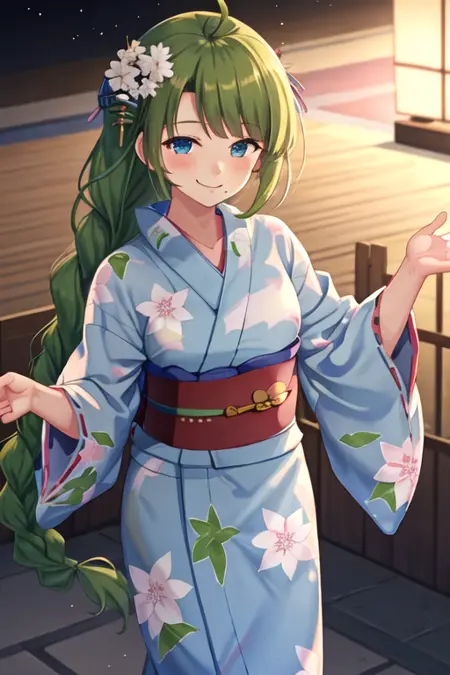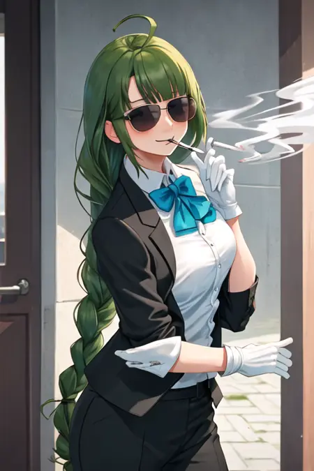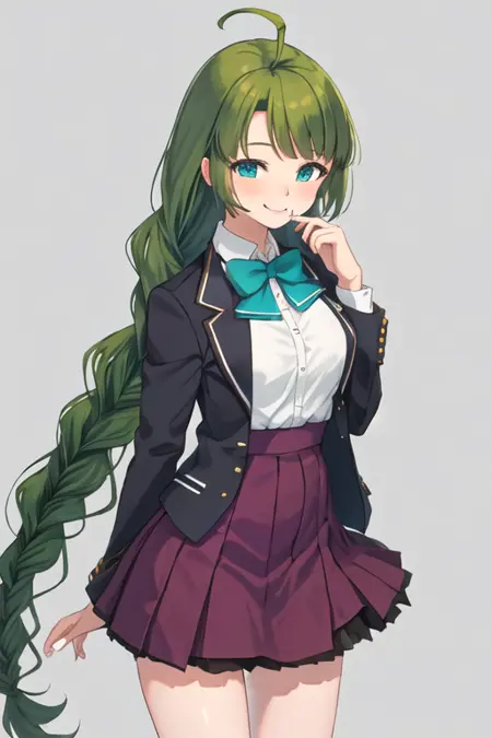 触发词为yuugumo_kantaicollection,推荐标签为:best quality, masterpiece, highres, solo, {yuugumo_kantaicollection:1.15}, green_hair, long_hair, mole, mole_under_mouth, blue_eyes, ahoge, braid, single_braid, very_long_hair, blush, smile, bow, bowtie, breasts。