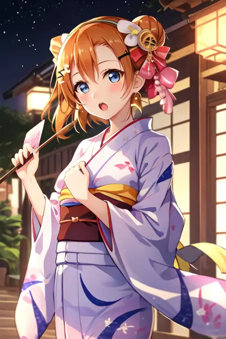 The trigger word is kousaka_honoka_lovelive, and the recommended tags are best quality, masterpiece, highres, solo, {kousaka_honoka_lovelive:1.15}, blue_eyes, orange_hair, one_side_up, smile, blush, short_hair, open_mouth, bow, hair_bow, hair_ornament.
