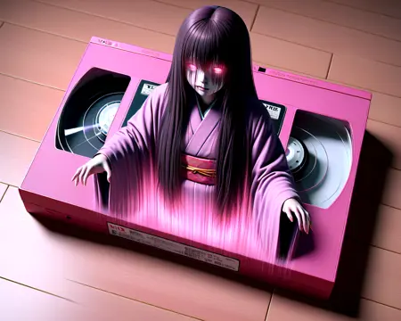 Despite Tom's warning, Jake picked up the label on the tape and stared at it with curiosity. "It's okay, I don't even have a VHS VCR at home," he reassured himself. The label displayed the eerie words 'Forbidden Footage,' and beneath it was an illustration of a weathered well. As Jake was staring at the label, a strange light suddenly emitted from the label, and an eerie being appeared from within the light.