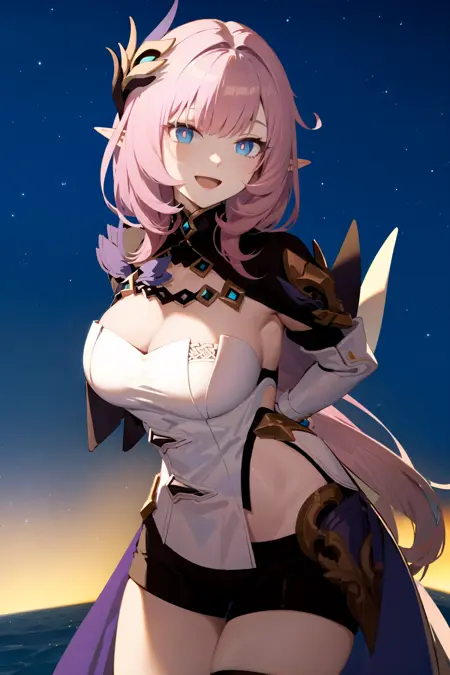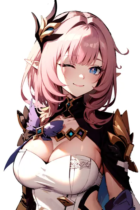 elysia (honkai impact), slit pupils, pink pupils, elf, pointy ears, pink hair, long hair, blue eyes, breasts, cleavage, bangs, smile, large breasts, ponytail [请详细描述您希望触发的服装……]