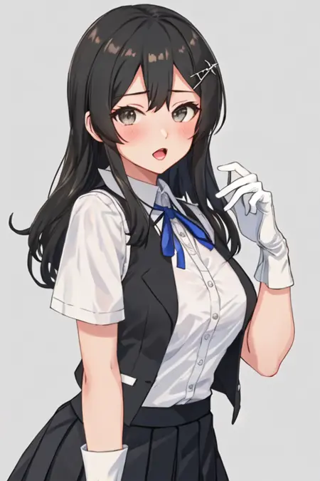 The trigger word is oyashio_kantaicollection, and the recommended tags are best quality, masterpiece, highres, solo, {oyashio_kantaicollection:1.15}, black_hair, long_hair, hair_ornament, hairclip, blush, vest, ribbon, black_vest, open_mouth, breasts, blue_ribbon, neck_ribbon.
