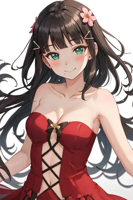 触发词为kurosawa_dia_lovelivesunshine,推荐标签为:best quality, masterpiece, highres, solo, {kurosawa_dia_lovelivesunshine:1.15}, black_hair, bangs, mole, mole_under_mouth, long_hair, hair_ornament, blunt_bangs, blush, green_eyes, smile, hairclip, aqua_eyes。
