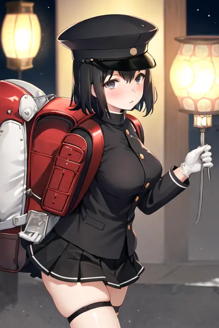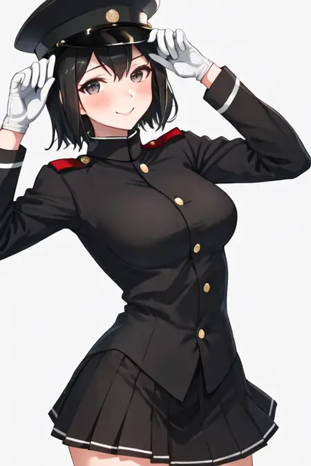 触发词为akitsu_maru_kantaicollection,推荐标签为:best quality, masterpiece, highres, solo, {akitsu_maru_kantaicollection:1.15}, black_hair, short_hair, hat, peaked_cap, black_eyes, breasts, military, large_breasts, blush。