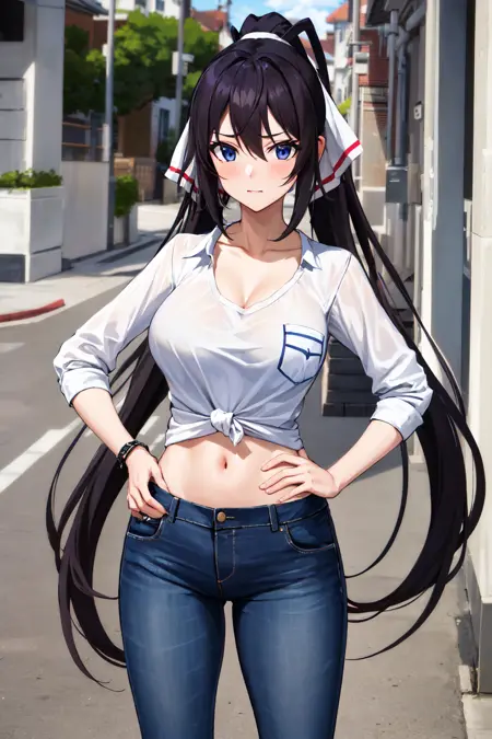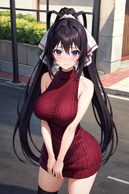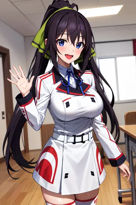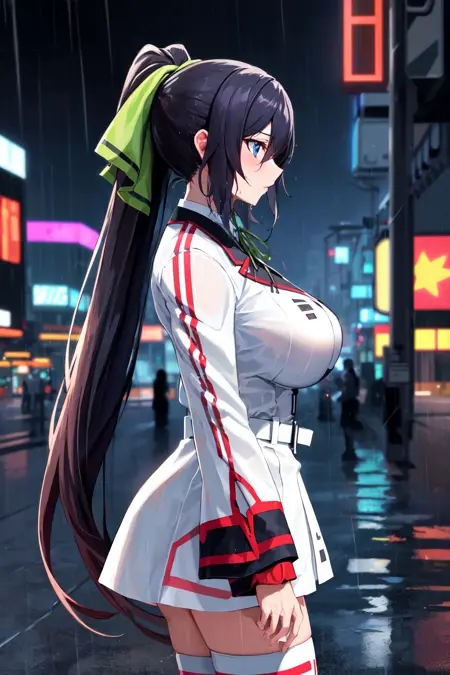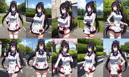 아우트피트1 (흰 리본 ↔ 녹색 리본)aahouki, 매우 긴 머리, 검은 머리, 높은 포니테일, 나뉜 포니테일, 머리 리본, 녹색 리본, 학교 유니폼, 목 리본, 흰 재킷, 흰 드레스, 긴 소매, 흰 허벅지 양말