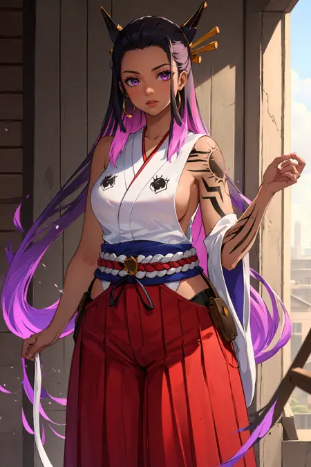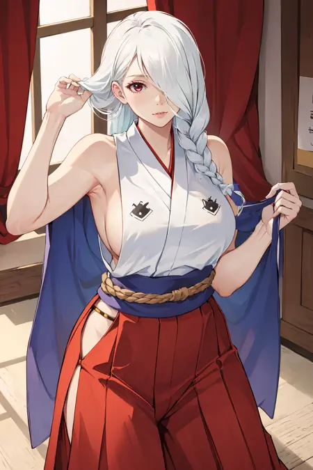 yamato cosplay, 1girl, sideboob, shimenawa, sleeveless, rope, hakama
