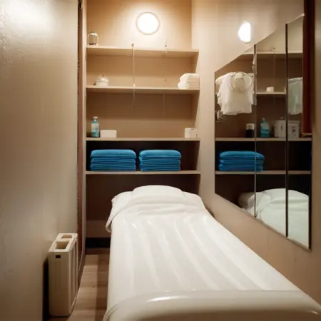 hakohel, scenery, pillow, bed, door, indoors, mirror, bag, toothbrush, shelf, tissue box, bottle, towel, alarm clock, calendar (object)