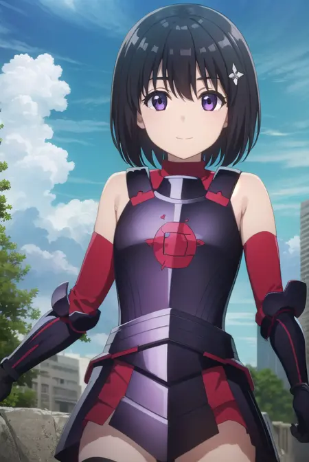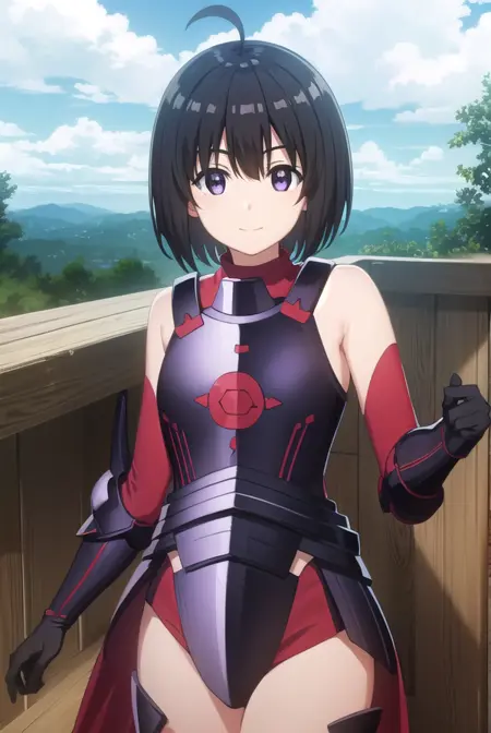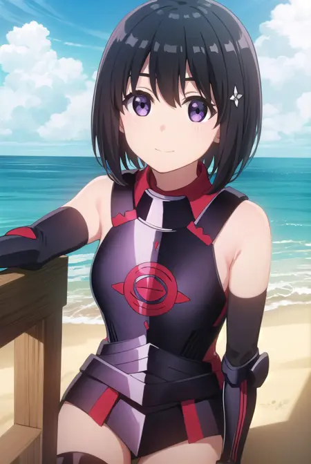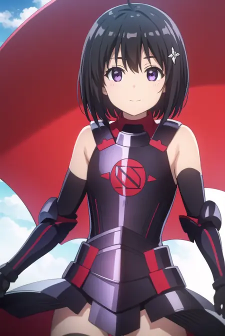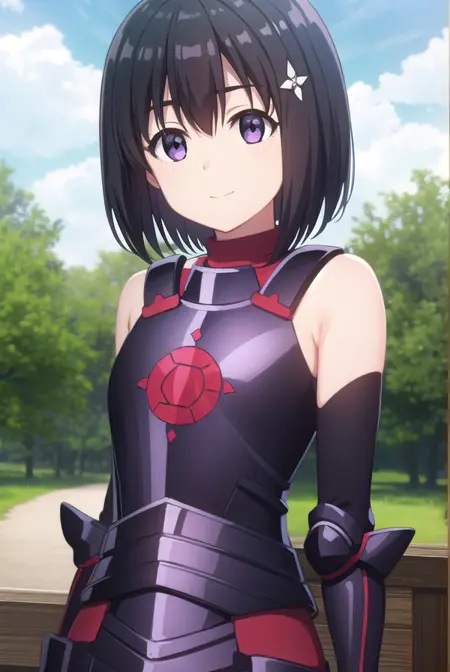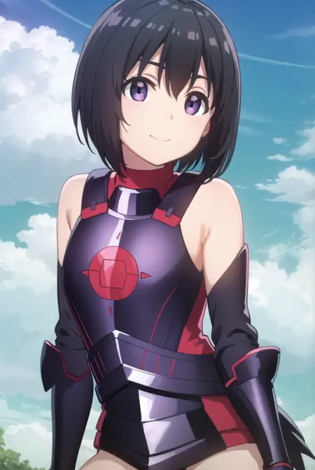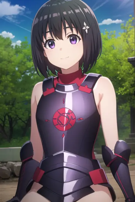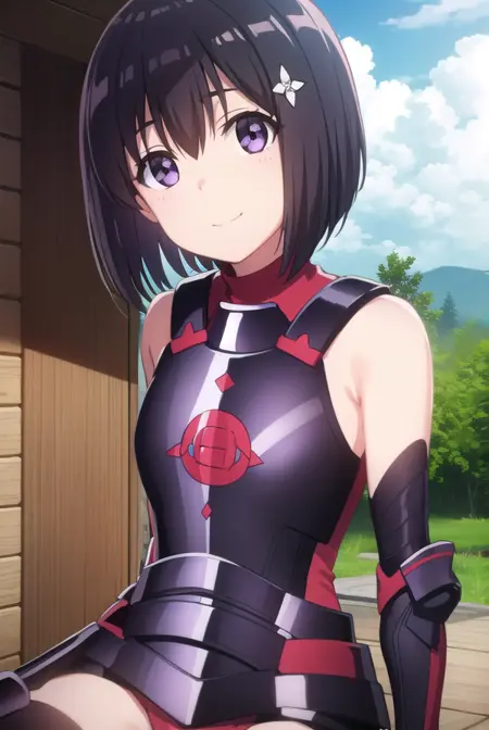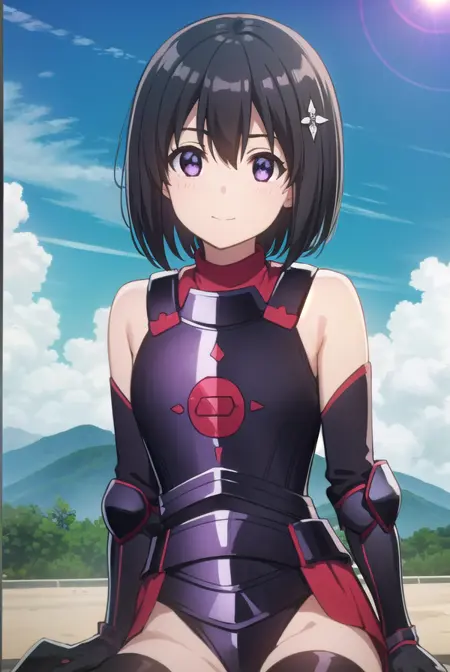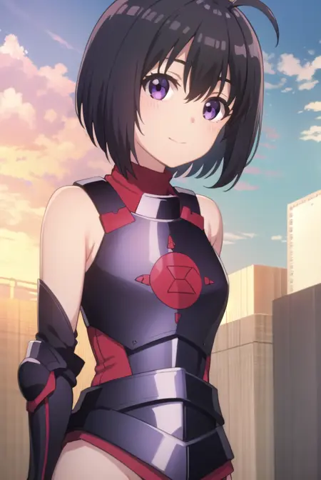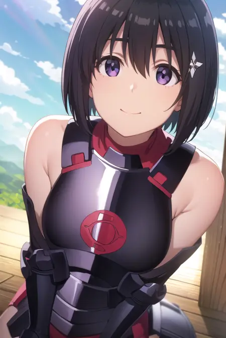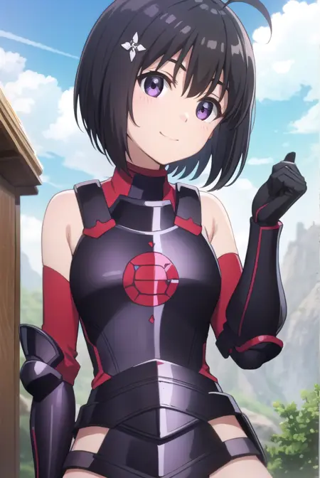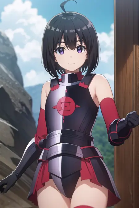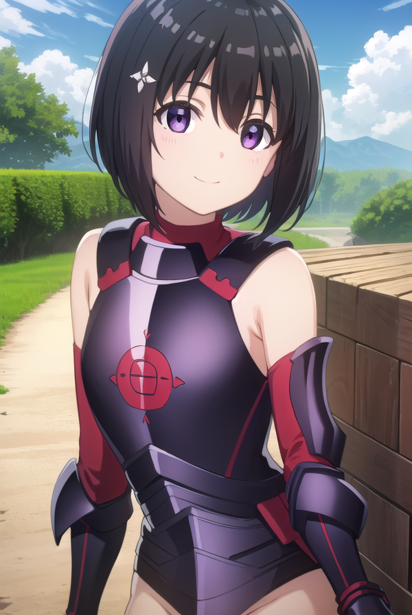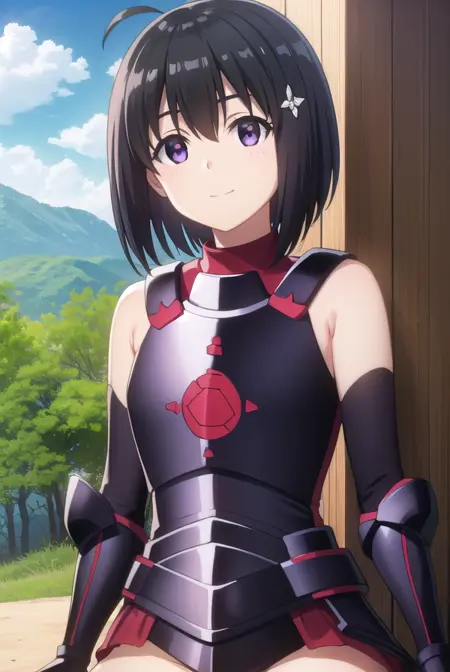 maple, short hair, bangs, black hair, hair ornament, (purple eyes:1.1), ahoge, bob cut,