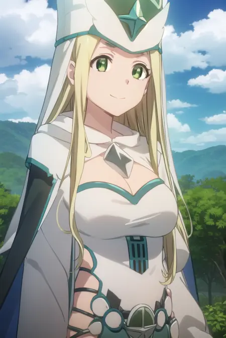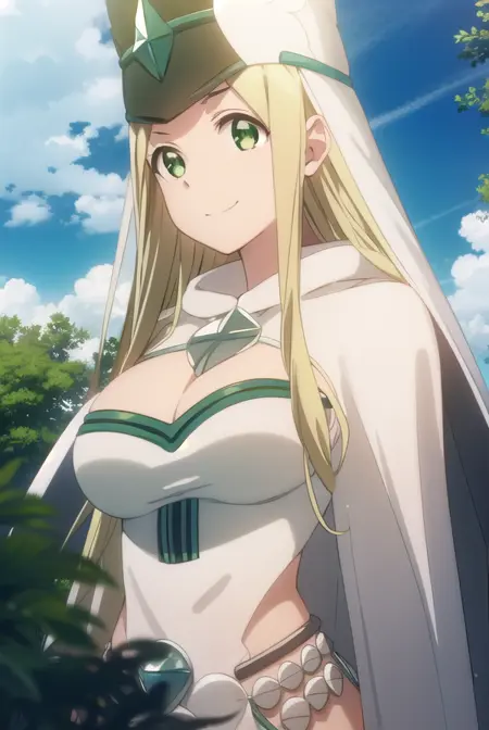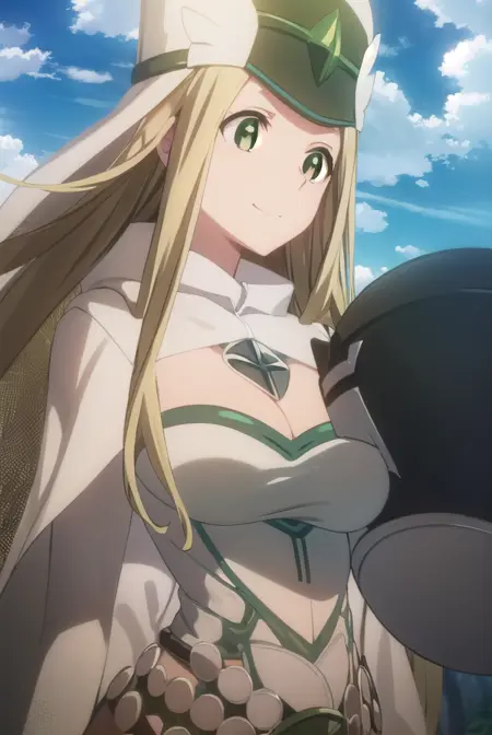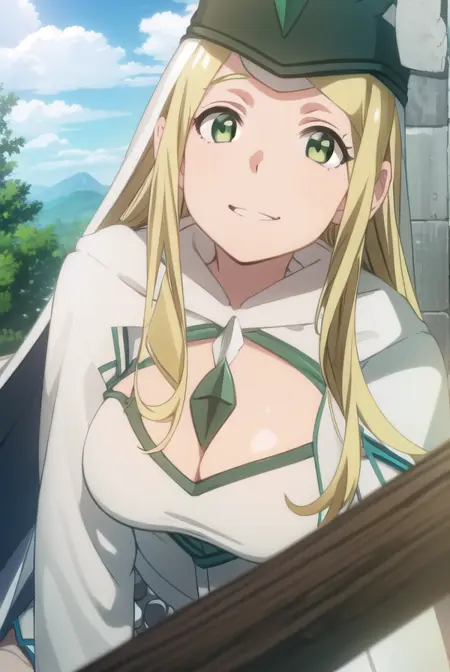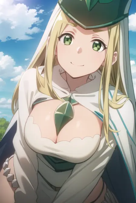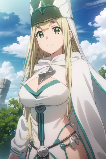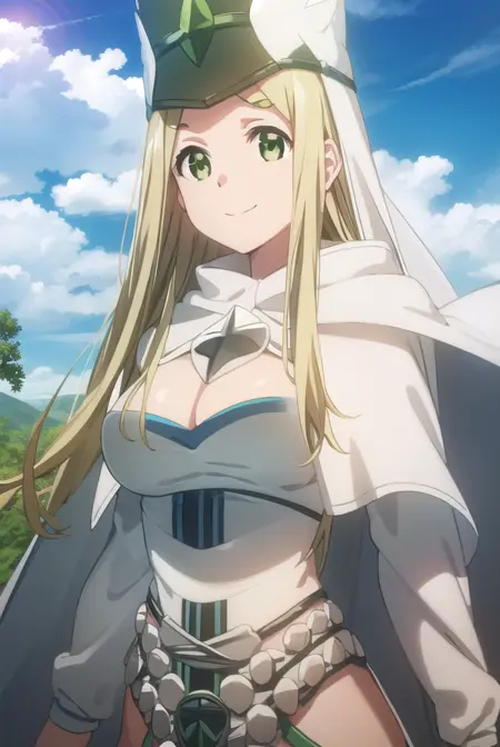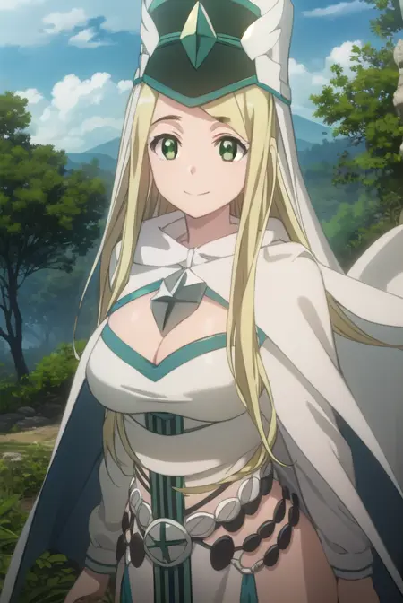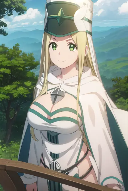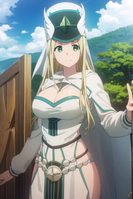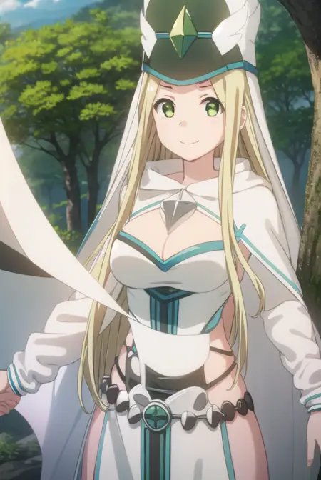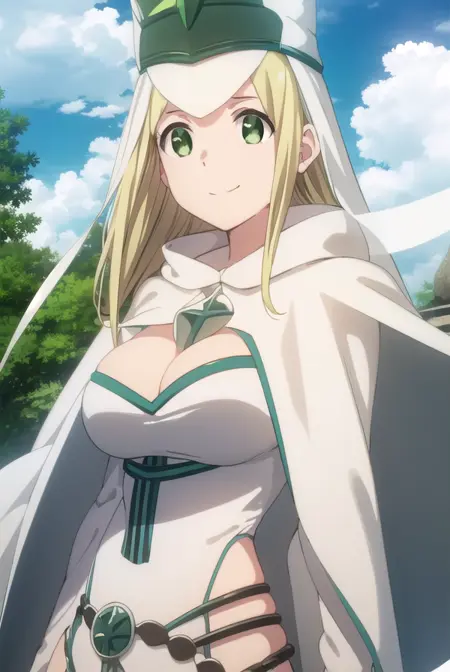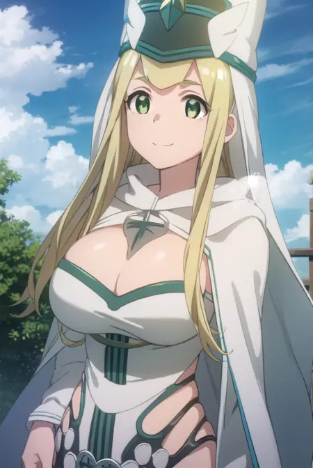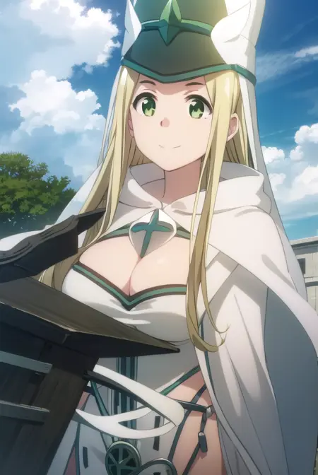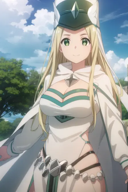 hat, cleavage, cape, white cape, dress, white dress, long sleeves,