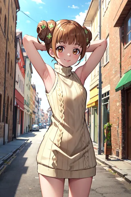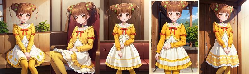 - bbalice,brown eyes,brown hair,short hair,double bun,bangs,clover hair ornament,choker,clover,ribbon,dress,yellow shirt,long sleeves,white skirt,frills,yellow pantyhose,shoes