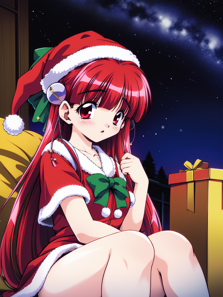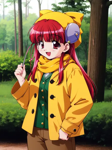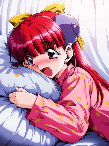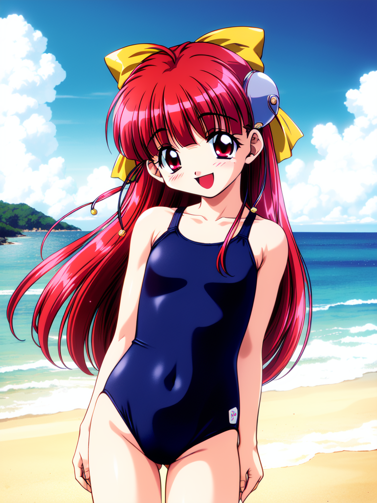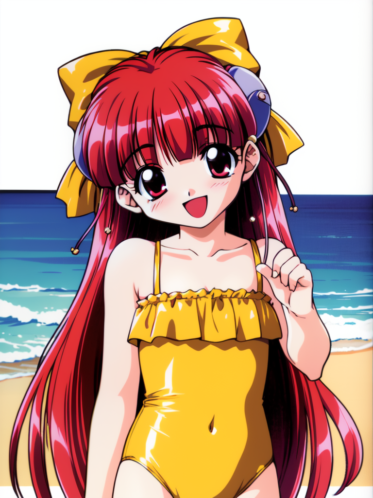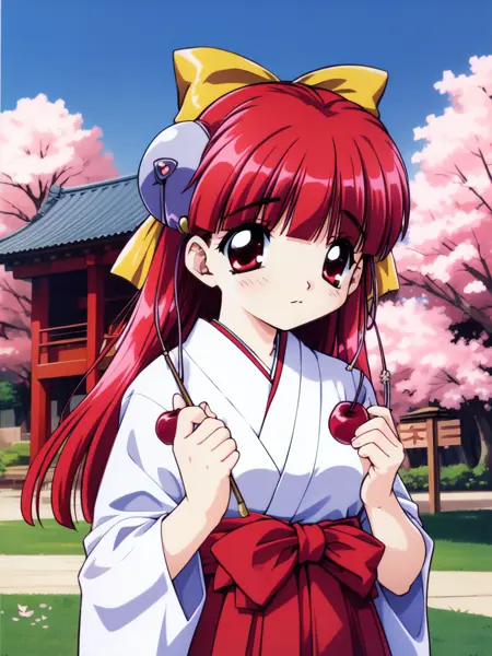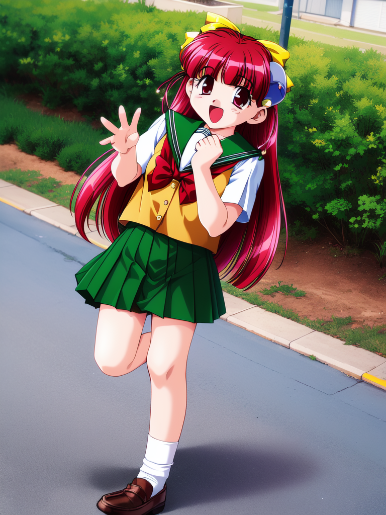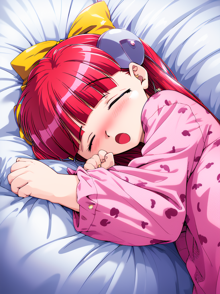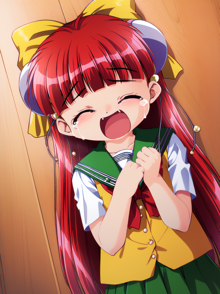 Nanako_RISE, 긴 머리, 빨간 머리, 빨간 눈, 작은 가슴, 앞머리, 머리 리본, 머리 장식, 노란 리본,