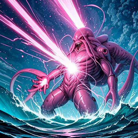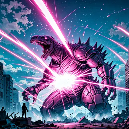 모델은 빔이 몬스터의 배에 직선으로 직격하는 이미지를 기반으로 하지만, 생성된 이미지에서는 빔이 산란된 형태로 나타날 수 있으므로, 완벽한 장면을 얻기 위해 빔의 강도를 조정하거나 여러 번 재생성해야 할 수 있습니다.