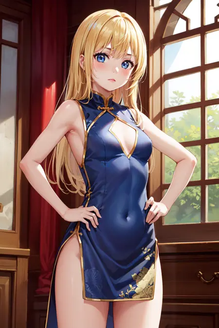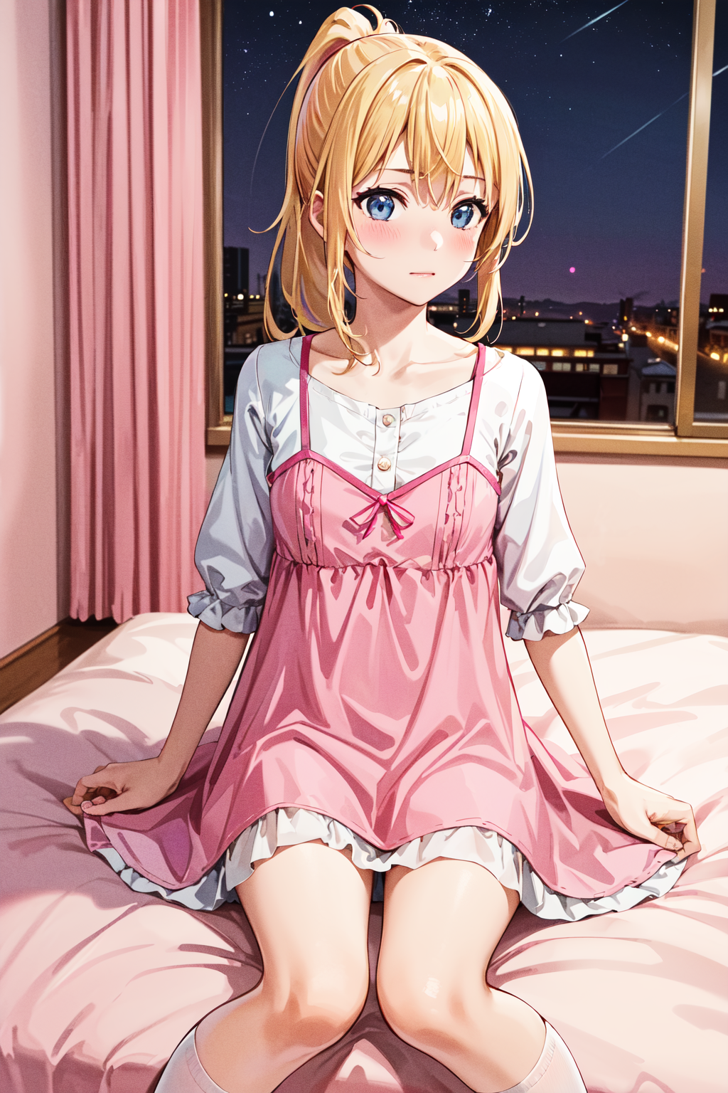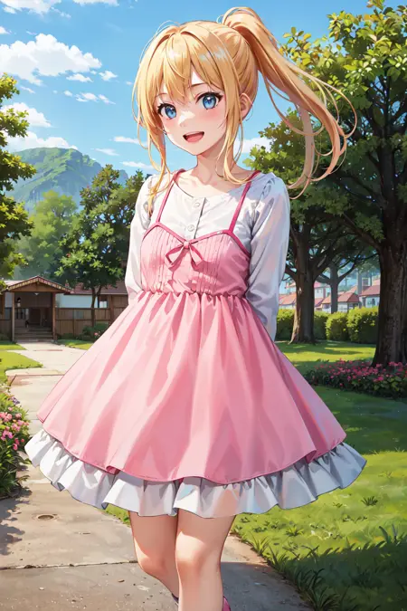 - bbkawori,1girl,blue eyes,blonde hair,long hair,ponytail,dress,(pink dress:1.4),shirt,white shirt,long sleeves,skirt,pink skirt,socks,(white socks:1.2),shoes