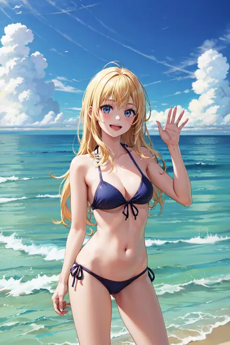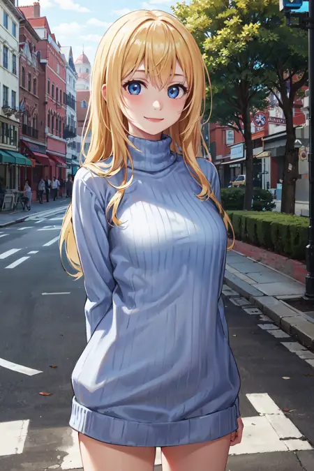 - aakawori,1girl,blue eyes,blonde hair,long hair,school uniform,blazer,jacket,grey jacket,open jacket,striped necktie,(red necktie:1.2),collared shirt,blue shirt,long sleeves,plaid skirt,grey skirt,socks,black socks,loafers