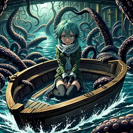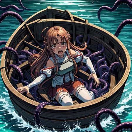 A small boat surrounded by a multitude of tentacles.