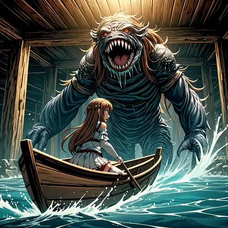 A giant monster appearing in front of the small boat.