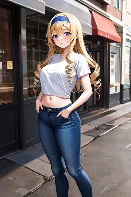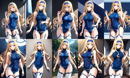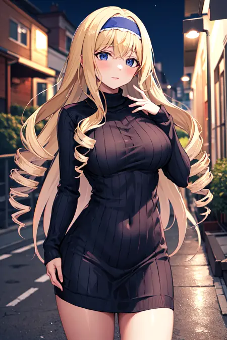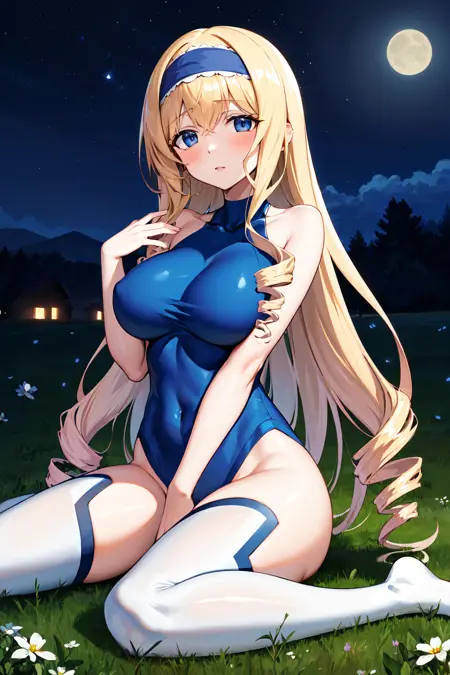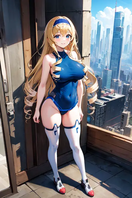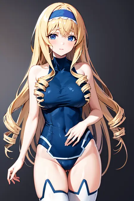 outfit2aacecilia, long hair, curly hair, drill hair, blue hairband, pilot suit, halterneck, bare shoulders, blue leotard, white thighhighs