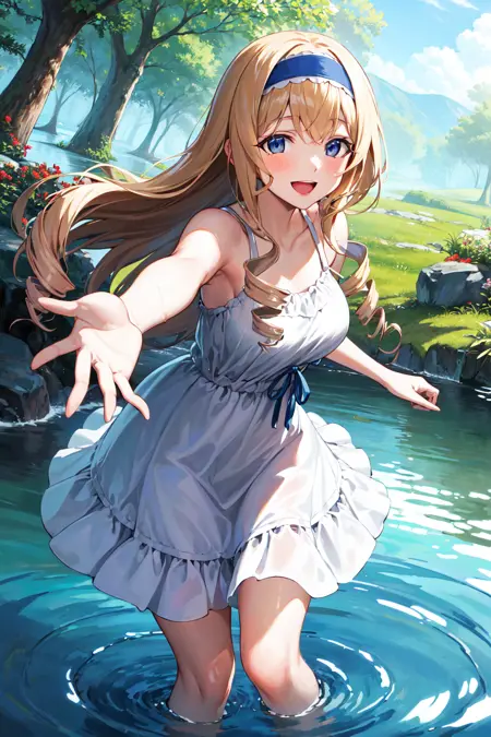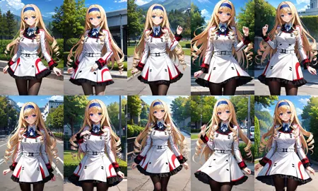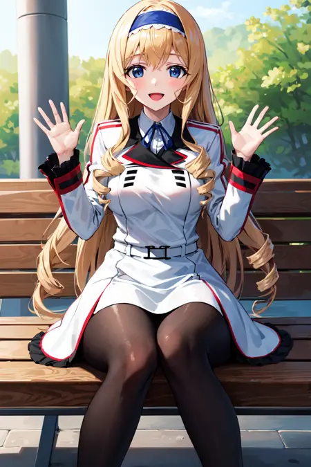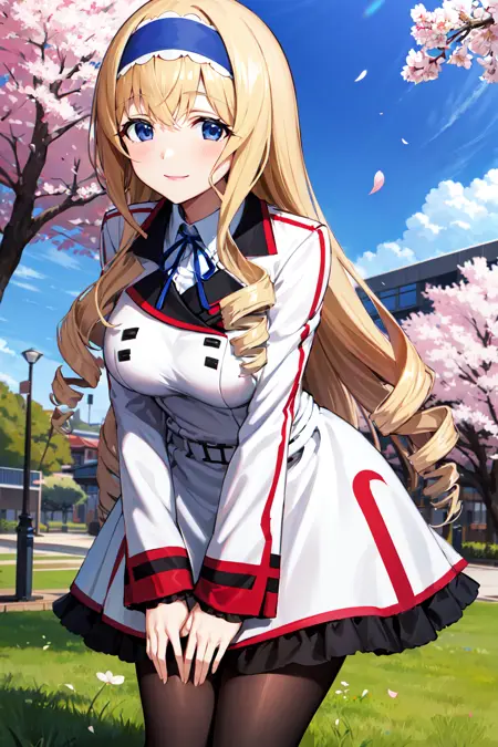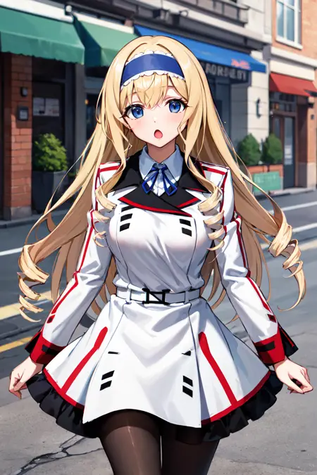 outfit1aacecilia, long hair, curly hair, drill hair, blue hairband, school uniform, white jacket, white dress, long sleeves, belt, black pantyhose