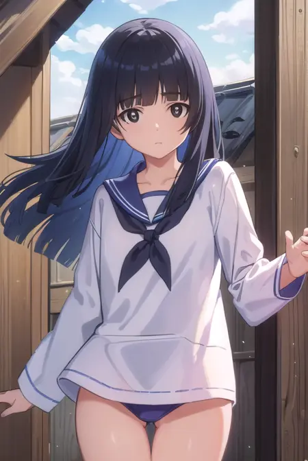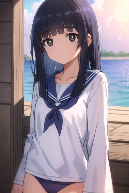 校服,泳装,serafuku,学校泳装,衣物下的泳装,长袖,衬衫,白衬衫,领巾,黑色领巾,蓝色水手领,