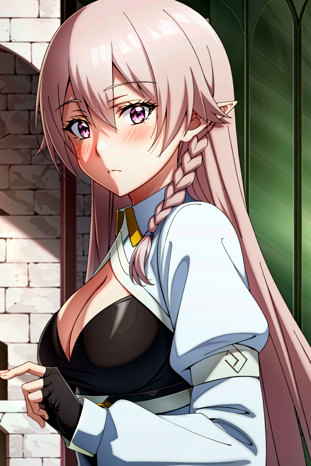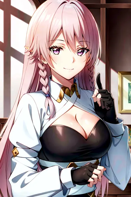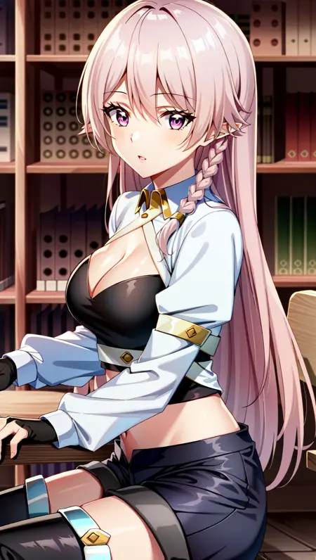 Luna Heela, 1girl, solo, fingerless gloves, long hair, thighhighs, pointy ears, gloves, breasts, braid, shorts, navel, cleavage, pink hair, black gloves, midriff, thigh boots, medium breasts, elf, couch, boots, crop top