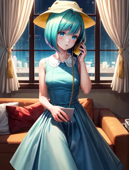 Additional words that may help: aqua hair, bob cut, blue dress, white collar, yellow hat