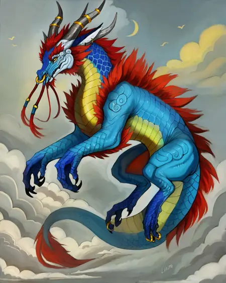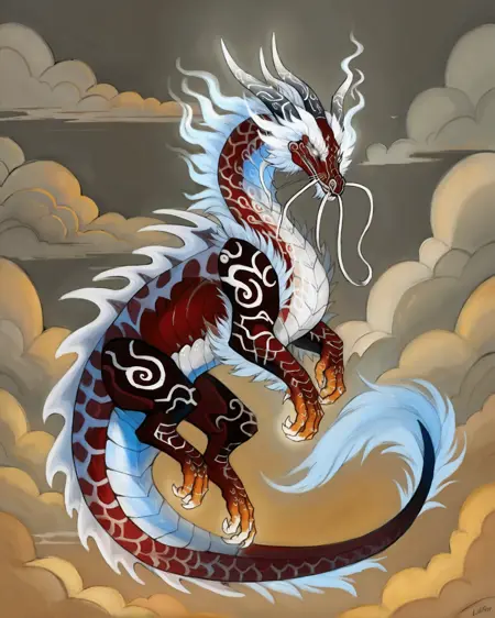 推荐的正面提示词:cloudserpent,东方龙,发光的眼睛*,发光的触须*,发光的装饰*,发光的手*,发光的脚*,X**鳞片,X**毛发,X**装饰*,鼻环*,角环*
