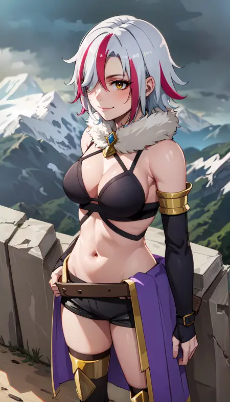white hair, streaked hair, hair covering one eye, metal bra, detached sleeves, bare shoulders, fur trim, purple waist cape, black shorts, yellow eyes