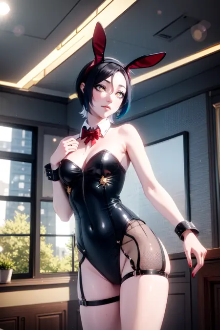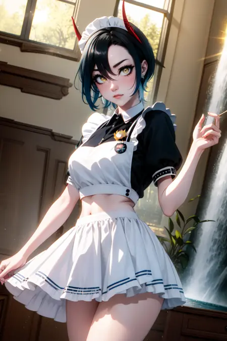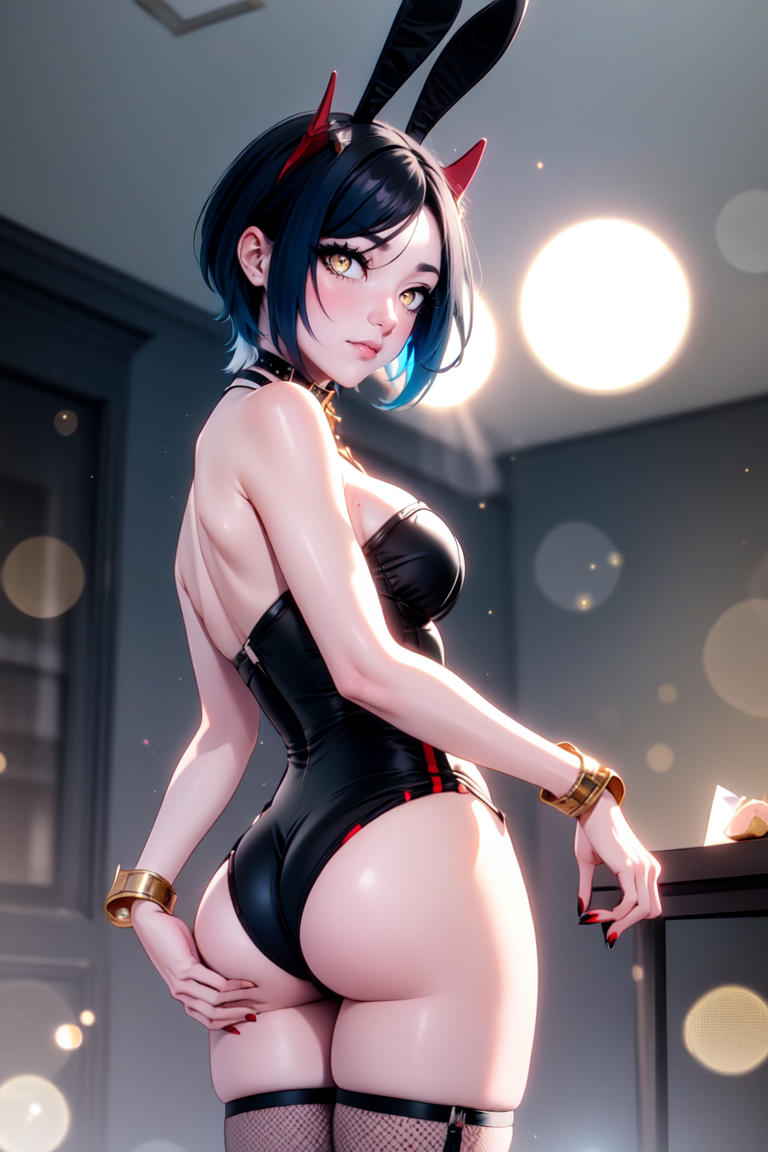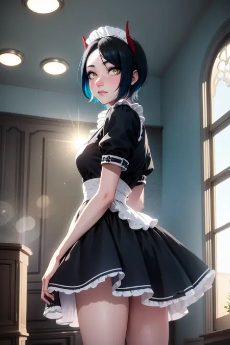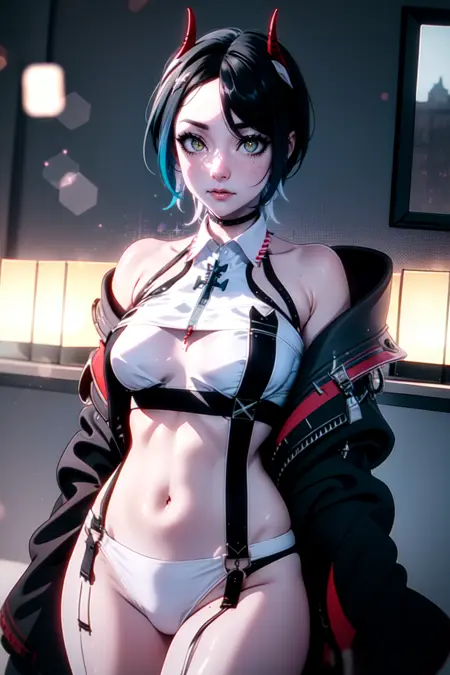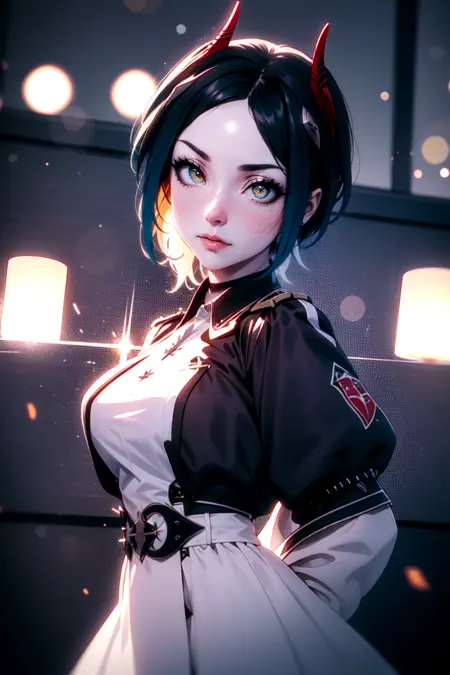 horns, (gold eyes:1.4), (blue hair, black hair)