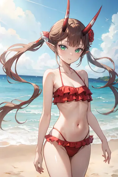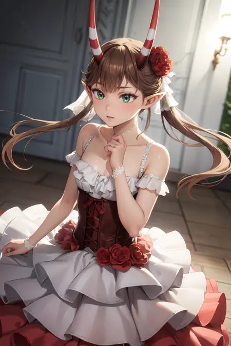 Apperance: msyu, long hair, twintails, pointy ears, horns, hair flower, red gloves, red thighhighs