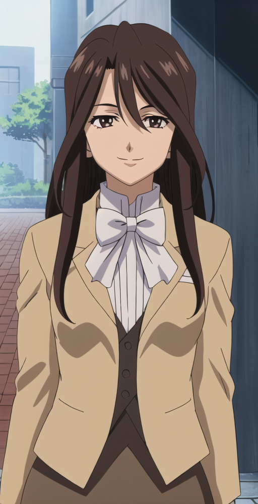 主要服装(最接近整体)搭配“上半身”、“蝴蝶结、白衬衫、卡其色夹克、长袖、棕色背心、卡其色短紧裙、丝袜”