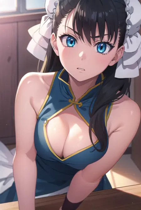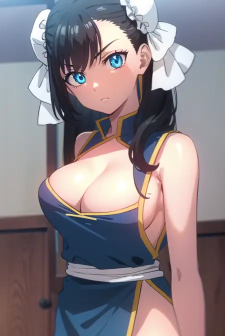 xuelan, blue eyes, black hair, hair bun, double bun, bun cover,