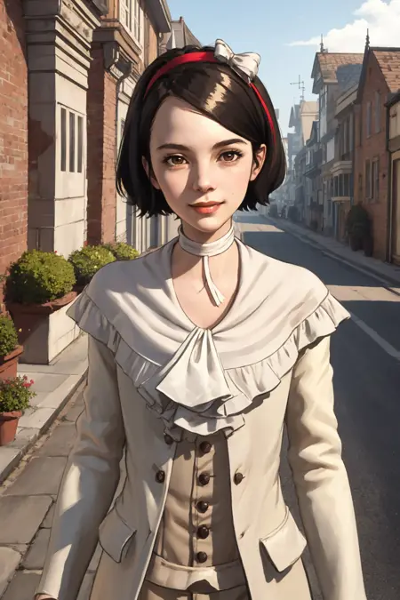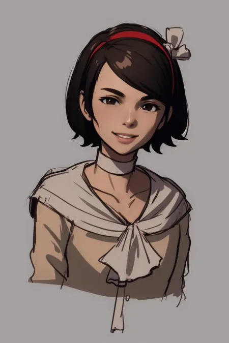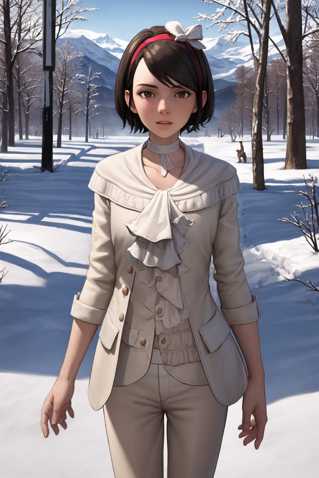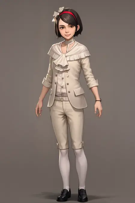 Basic prompts : 1girl, black hair, short hair, brown eyes, hairband, hair bow, choker, pants, shoes