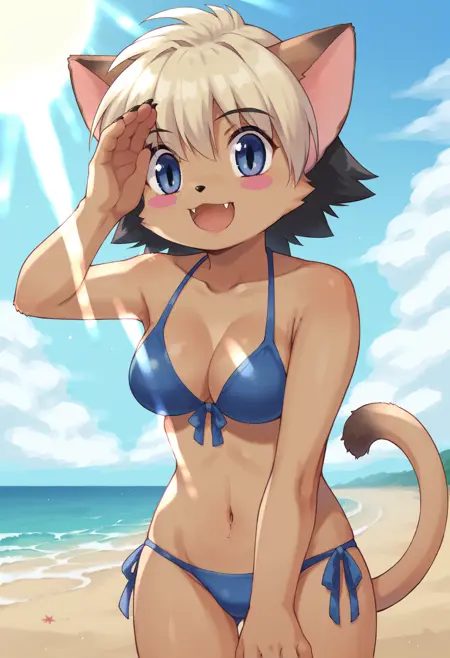 有効なタグ:1girl、ショートヘア、青い目、茶色い毛、動物の耳、多色の髪、染めた前髪、金色の髪、黒髪、尾、動物の鼻