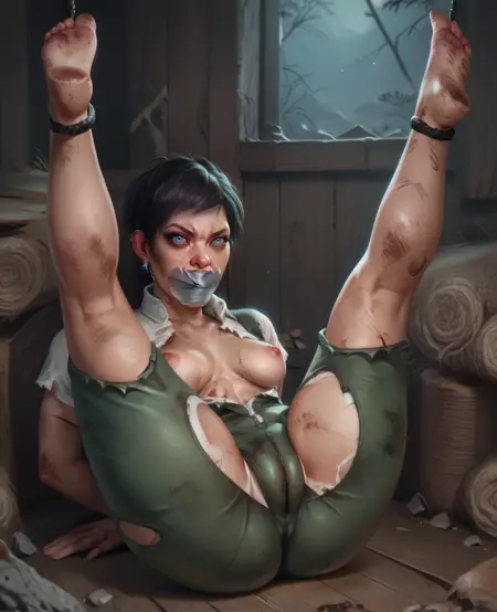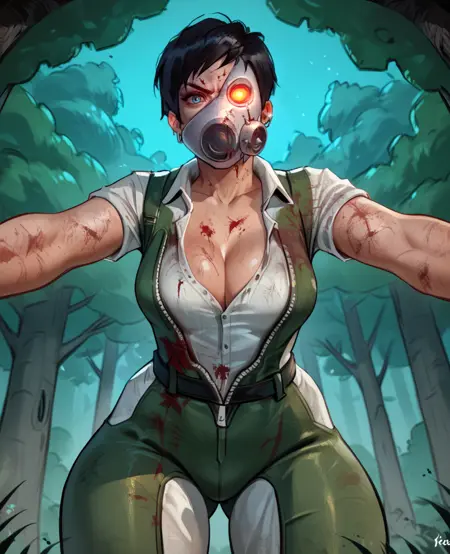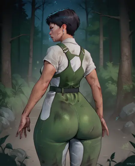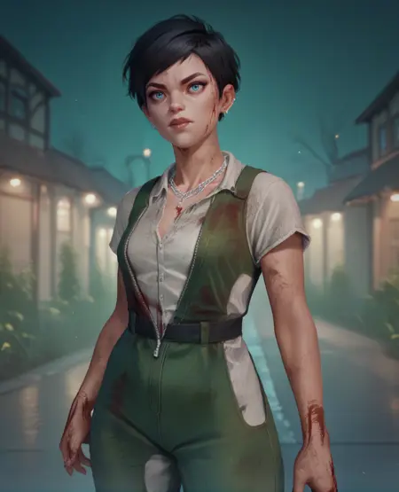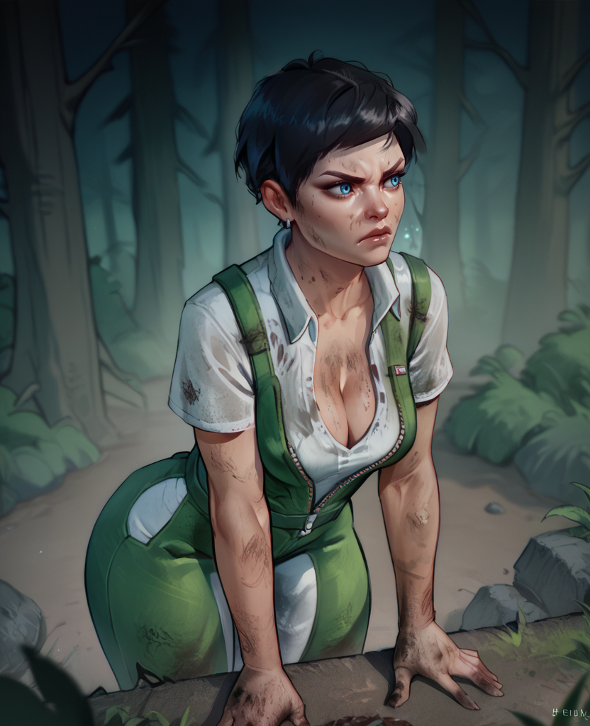 green jumpsuit, white shirt, or jumpsuit, short sleeves, belt, harness, or straps,