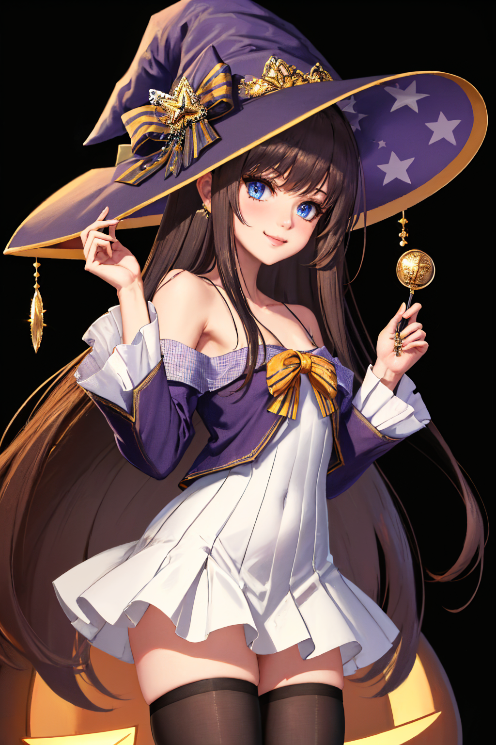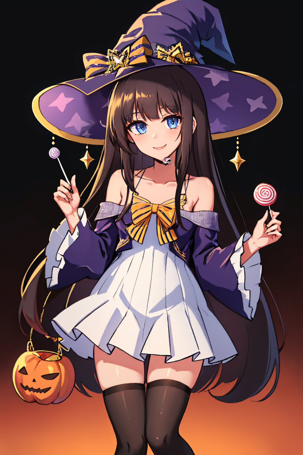 Spooky Stream: longislandspook, witch hat, dress, bow, detached sleeves, thighhighs, bare shoulders, collarbone