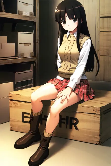 学ラン、セーターのベスト、白シャツ、チェックスカート、ブーツ
