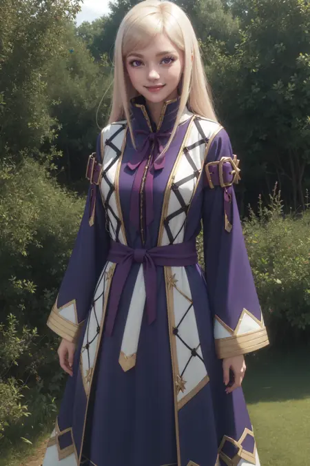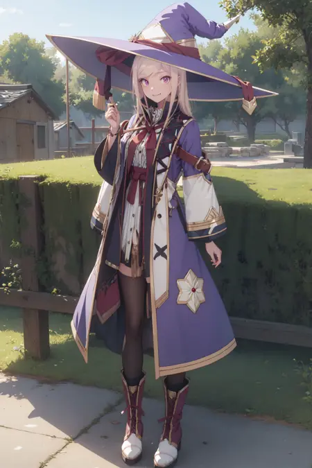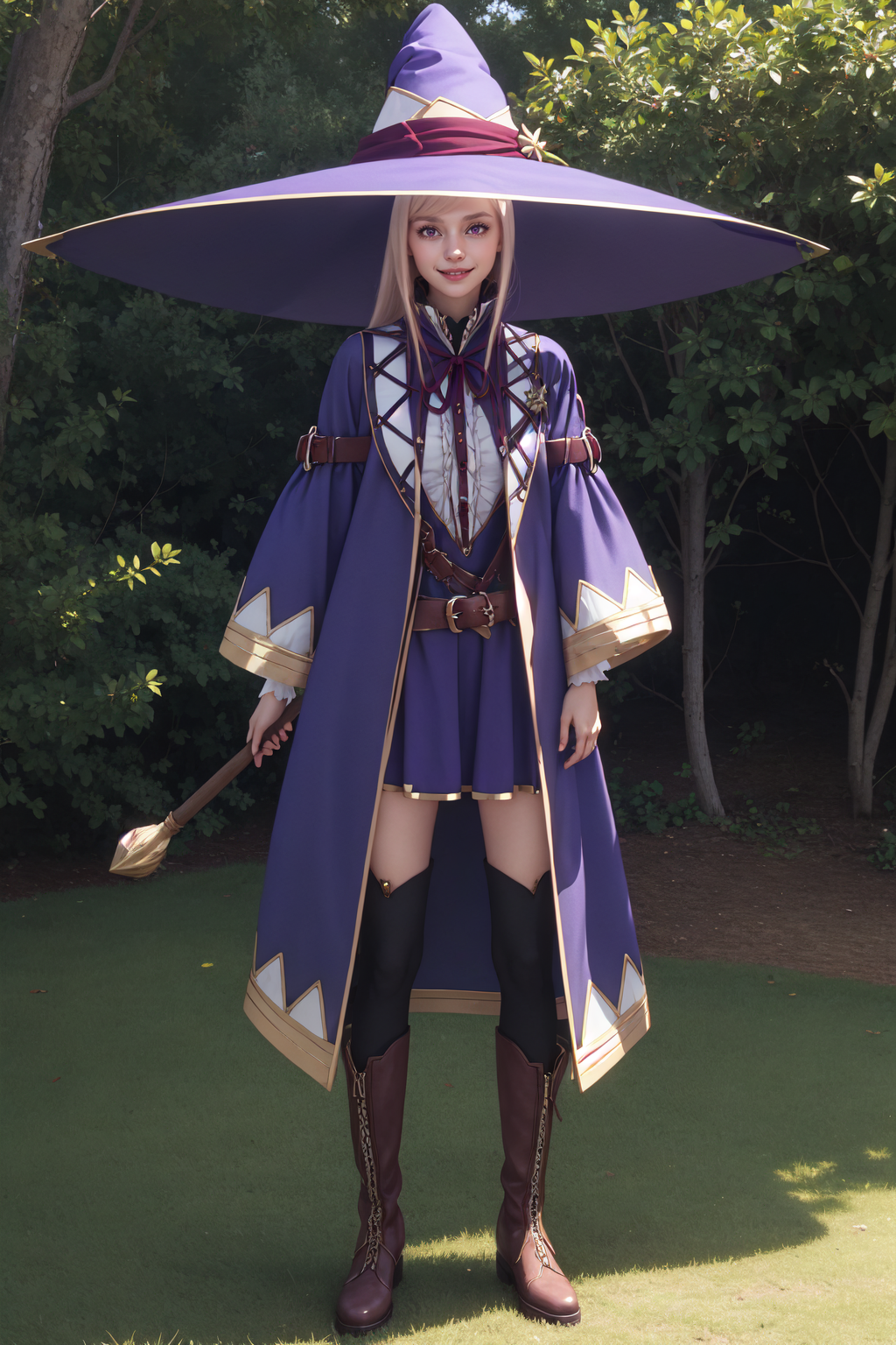 Outfit : witch hat, ribbon, witch, wizard, belt, jewelry, purple dress, dress, wide sleeves, boots,